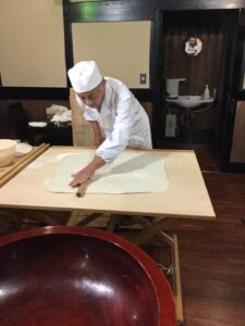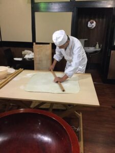 上下の部分の肉分けは、麵棒を縦に使う一茶庵片倉先生直伝とのことです。 25年前、店で打っているのを見て、何度も真似てみましたが上手くいかず。